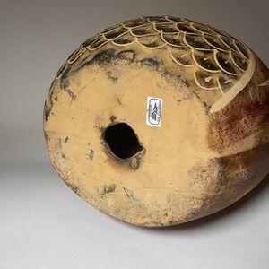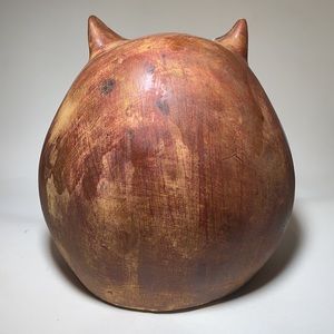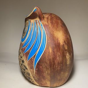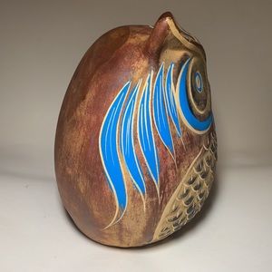 Hollow inside. Was intended to be an owl bank, but has no coin slot. Clay. Has opening at bottom. Blue, yellow, brown.