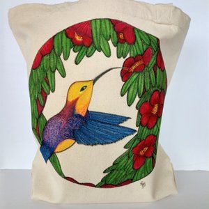 Handmade Painted Tote Bag Blue & Gold Hummingbird in Red Flowers 13.5x13.5x3.5