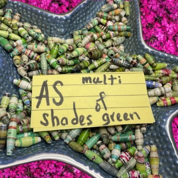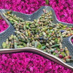 The listing includes 2 0z. of handmaid paper beads. Beads are coated with acrylate polymer. The application of this spray protects the beads, and a gives them a glossy appearance. This collection includes a variety of colors, sizes, and shapes. You will receive this exact listing.