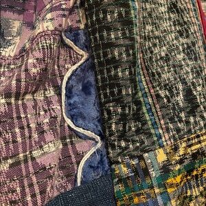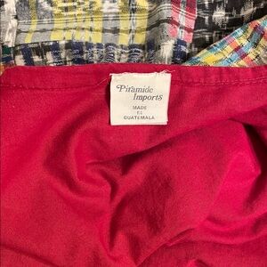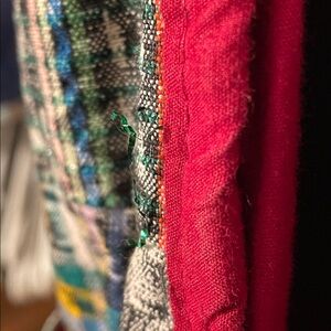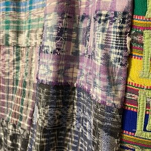 Probably vintage as Piramide Imports has been sold in the USA since 1981. Made in Guatemala of 100% handwoven cotton, this patchwork jacket is in great condition with only a couple thread ends protruding from the jacket’s exterior (see photos). A dark red cotton lining and trim contrasts the bright busy patterns, two front pockets are of decent size, and loose fit means extra comfort and the ability to layer underneath. This piece has no stains, holes, or snags.