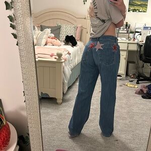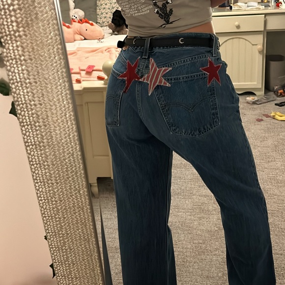 These beauties took me a full day to make. The vintage Levi’s had some wear in the back so I decided to transform them with some cute star patches that I crafted🫶