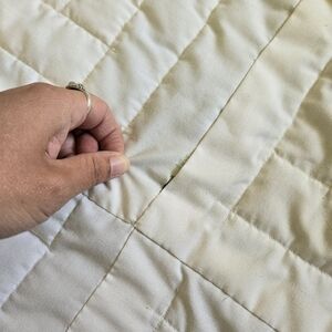 Good used condition as pictured. Some minor marks on cream back (I have not laundered this quilt). Few holes from loose stitching here and there.