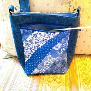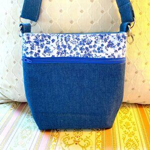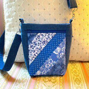 This is a handmade one-of-a-kind Patchwork Quilted mini crossbody bag. It is quilted of 100% cotton and denim and constructed with interfacing and light batting for structure and stability. The front pocket has been diagonally machine quilted with coordinating thread. It features an adjustable strap, lining with pockets, silver tone hardware and magnetic snap closure. The front of the bag has a quilted, patchwork zippered pocket made of blue floral cotton fabric, and the back has a denim zippered pocket with a blue floral upper. It has a light blue cotton lining with 2 interior slip pockets. The adjustable strap can be used as a crossbody or a shoulder bag. THis is a very cute bag, handmade with care and attention to detail. So durable and versatile, yet so fun. You will just love carrying this little bag for the weekend.