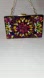 This hand embellished black acrylic clutch with is adorned with iridescent crystals, with hues of orange, red and green.