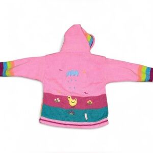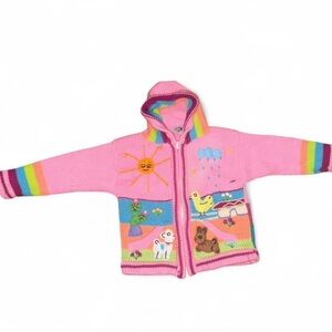 HANDKNIT SWEATER: Handmade in Peruvian Andes by local indigenous people, and is made from a blend of natural and synthetic fibers for comfort and breathable knit. Vibrant pink knit hoodie with playful animal and nature designs. Features a rainbow pattern on the sleeves.