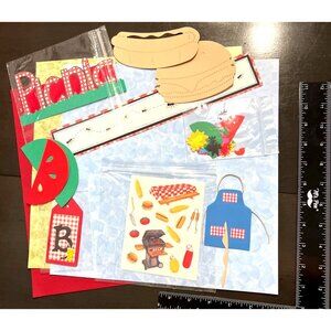 Enhance your creative projects with our picnic-themed scrapbooking kit, featuring various embellishments such as watermelon slices, hot dogs, and picnic-themed cutouts.