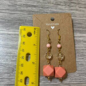 Add a pop of color to your look with these handmade dangle earrings featuring a fun mix of textures and shapes. Designed with soft pink round beads, clear faceted crystals, and bold geometric cube beads, they hang beautifully from gold-tone fishhook ear wires.