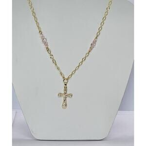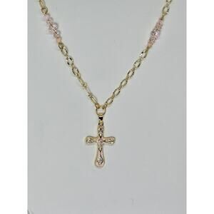 The necklace features pink crystals and mother of pearl beads interspersed along the 15-inch gold-plated chain, with an additional 2-inch extender for adjustable comfort. This beautiful, handcrafted piece is perfect for layering with other necklaces or wearing alone as a statement of faith. Whether you're looking for a thoughtful gift for a Christian individual, someone who loves cross jewelry or for yourself to express your personal style, this pink enamel cross necklace is sure to be cherished.