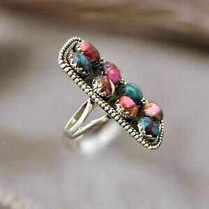 Handmade Pink Dahlia Spiny Oyster Long Native American Style Ring Sterling Silver Size 8