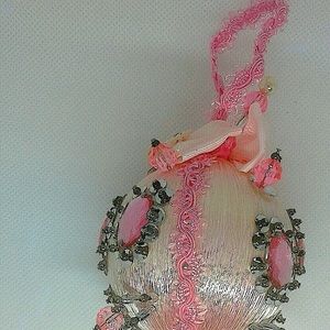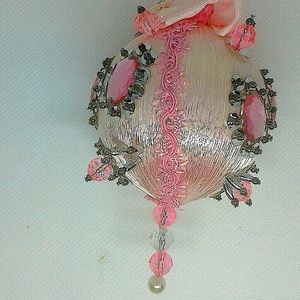 Handmade Top=6mm faux white pearl pin, 8mm lt. pink,clear,8mm lt. Pink faceted acrylic eds. Same as bottom pin. Satin pink bow=faux pearl β€&clear rhinestone. Set of 3=2-3mm oxidized silver plated spacer balls(all pins have them)&3 8mm acrylic rds.&10mm silver sequins. Middle=3 lt. Pink oval rhinestones with 6mm silver sequins&8mm acrylic rds. Bottom=8mm acrylic rd.,12mmm silver sequin with 6mm silver sequin all around.Each side=apx.4Γ6mm silver plated rice beads. Side &hanger=Pink rick rack lace This is for anyone to enjoy especially breast cancer survivors!!!