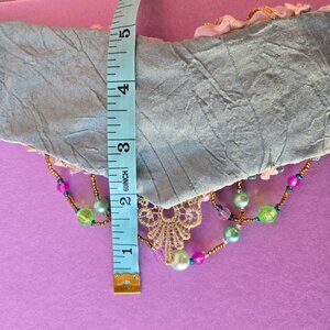 Step into Victorian elegance with this stunning handmade choker collar! Adorned in soft pinks and mauve, it features intricately embroidered roses, delicate 1920s-inspired velvet accents, and ornate stitching throughout. The textured design combines vintage glass beads, acrylic, and plastic elements to create a lightweight, wearable fringe that won't weigh you down. Crafted from collected and vintage materials for that one-of-a-kind charm. This larger-sized piece comes with a double extension chain closure for the perfect fit. Need adjustments? Just reach out— I am happy to customize the length for you.