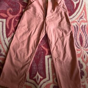 Handmade and truly one of a kind. Dreamy pink rose pants made of 100% cotton canvas. These are durable enough to work in! Cute high-water length, looks great with boots, heels, sneakers or sandals. Deep front pockets. Button is hand carved from yew wood. Handmade rose stamp is on the inside lining of the waistband. 27" waist, 36" hips, 24" inseam.