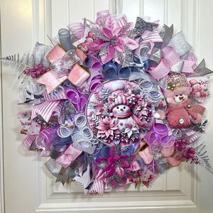 Handmade Pink Winter Snowman Holiday Ribbon Door Wreath 22 ins W80