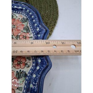 Handmade Polish Pottery Floral Square Plate 10" Scalloped Edge Blue & Coral Flow