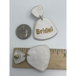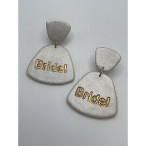 The earrings are absolutely adorable and perfect for the BRIDE. Handmade of polymer clay, in a white pearlescent color with bride! Stamped into them will match any outfit and show your happiness of being a bride. Drops approximately 2 inches. Brand new on blossom by Heather card. Comes from a smoke free home.