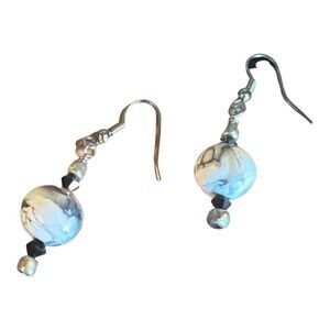 Handmade Polymer Clay statement necklace and earrings set black white and translucent with black swarovski crystal beads silver tone and pearlescent accent beads. This artisan crafted jewelry set includes a wire wrapped focal piece and many crafted accents. It has a toggle closure. The approximate measurements are as follows.