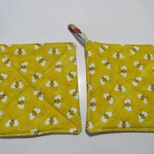 Handmade Potholder, Set of 2, Reversible Bees and Floral Quilted Hot Pads