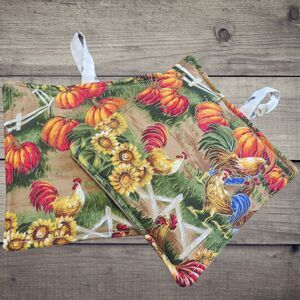 Handmade Potholder, Set of 2, Reversible Fall Pumpkins Roosters and Chickens