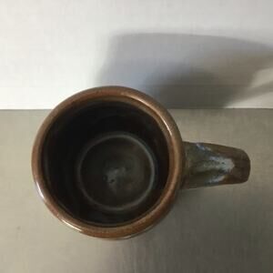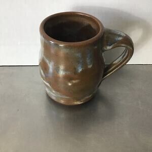 Handmade Pottery Mug with a brown, blue and a small amount of cream glaze. signed