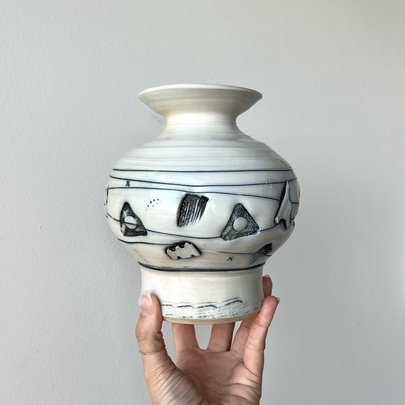 Handmade pottery vase signed Husby. Husby pottery is a husband/wife team from Duluth, Minnesota. Abstract shapes design. In great condition! I’m unsure if this is vintage or modern made.