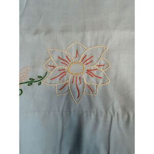 This is a set of powder blue handmade pillowcases. They have flowers embroidered on them. They look to be older and there is a small stain on the edge of one that I have pictures. These are very cottagecore and soft and pretty. I have the measurements in the pictures. They appear to be about standard size from the looks of them.