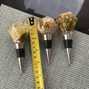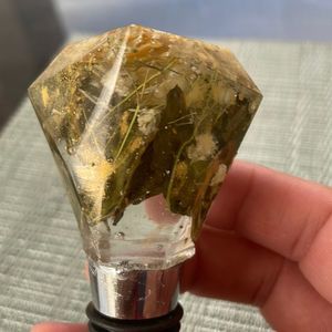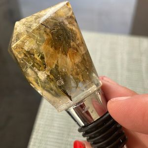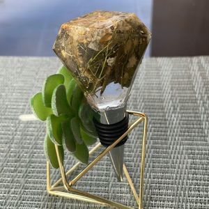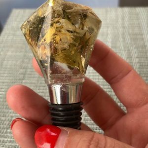 Handmade pressed flower wine stop in Diamond shape with lots of cream warm gold colors inside. Classy and sparkles. Cute accessory, makes a great gift. Lightweight and eye catching. Jazz up your home or party with these fabulous hand crafted statement wine stoppers.