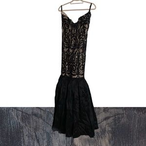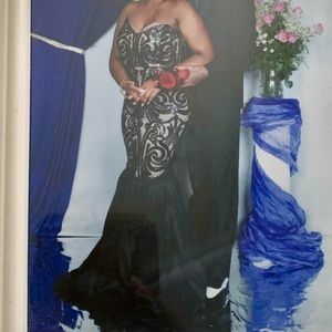 Black Handmade mermaid dress worn once. This dress has a plunge neckline and a mermaid silhouette. The fabric has a little bit of stretch. I'm 5'6" and wore 1" heels. It can be worn for a gala, ball, wedding, or prom.