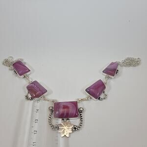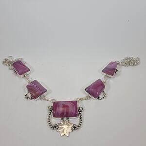 This stunning handmade necklace showcases geometric slices of purple agate, each uniquely patterned and set in high-quality sterling silver. The vibrant hues of lavender and soft pink are complemented by the intricate silver leaf motif in the center, adding a touch of nature-inspired elegance. This necklace features square and triangular agate stones, expertly arranged to create a modern yet organic design that makes it perfect for both casual and formal occasions. Measuring approximately 20 inches in length, it provides a comfortable fit and secures with a sterling silver clasp. As a one-of-a-kind piece, this necklace is a beautiful tribute to nature’s beauty and a statement of sophisticated craftsmanship. Ideal for gemstone lovers, this agate necklace is a striking addition to any jewelry collection.