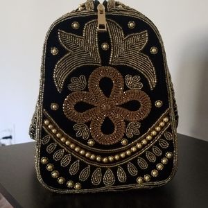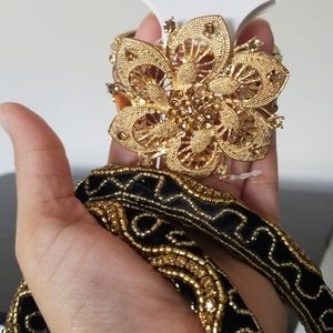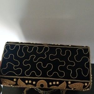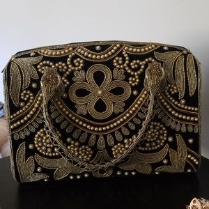 I traveled to India in May of 2017 and found this gem at gorgeous mom and pop store that made these beauties from scratch. The outside material is smooth crushed velvet and the beads and gems a goldish amber tone with matching faux pearls. I love it so much, but I never get around to using it! I hope it finds a lovely home:) Bonus: I'm including a bracelet I bought to match!