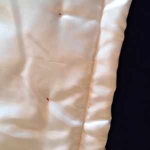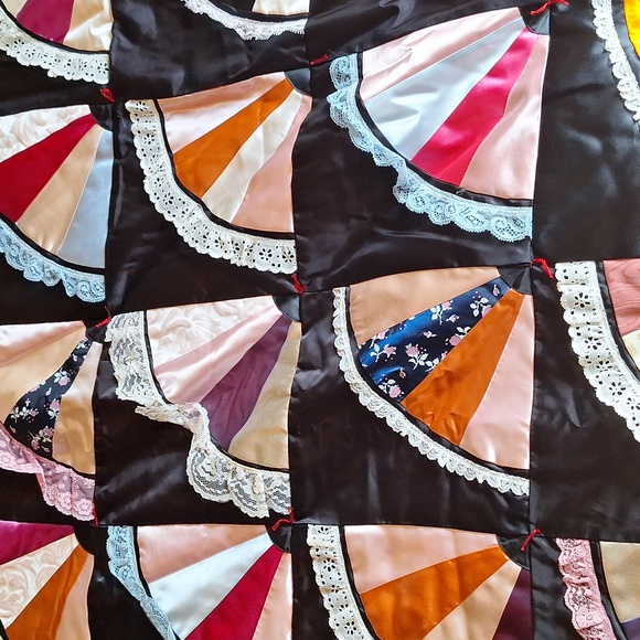 Handmade satin quilt. Each square is made with four different colors. Colors include blue, red, beige, pink, orange and flowered pieces. Lace finishes each square and each one is different.