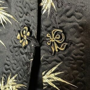Handmade Quilted Asian Inspired Black & Gold Bamboo Print Jacket. Two front pockets.