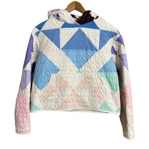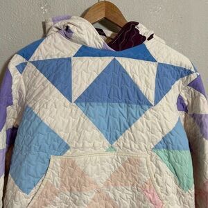 This handmade quilted patchwork hoodie jacket is the perfect statement piece for lovers of boho fashion, vintage aesthetics, and unique, one-of-a-kind clothing. Featuring a boxy, cropped fit, this S/M pullover hoodie is made of soft cotton with an artsy, eclectic design.