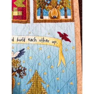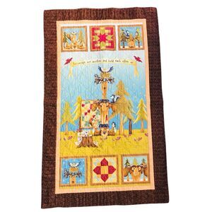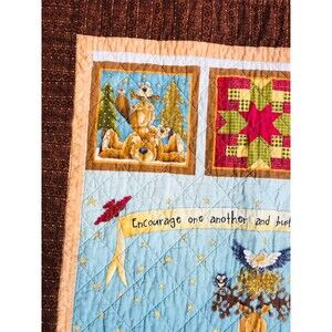 This is a Handmade Quilted Table Runner. The colors are in Tans, Browns. Greens and more. It measures a generous 47x28", making it a good runner for a large table or a coffee table. It could even be used as a lap blanket. It features "Encourage One Another and Build Each Other Up", emphathizing it with adorable animals stacked up on each other! So cute!