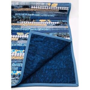 Handmade Quilted Table Runner Navy Blue Ginghams Florals Stepping Blocks 43x15"