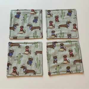 Features: set of 4 fabric quilted coasters, western weenie print, cowboy dachshunds.
