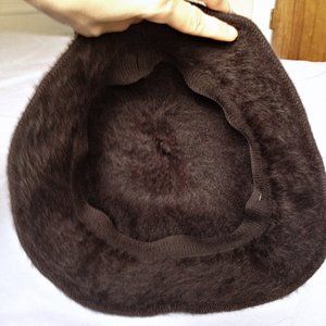 Beautifully handmade bucket hat made of rabbit hair and angora wool by a local NYC artist. Very soft and fluffy, this dark brown hat also has a detachable rabbit hair flower corsage in olive color with slight ombre effect. The flower corsage is especially soft and fluffy, and looks equally great pinned on the lapel of your favorite coat. Looks real classy and spunky at the same time.