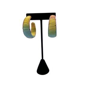 Vibrant handmade raffia thread-wrapped hoop earrings in a rainbow palette. Lightweight zinc alloy with a sturdy closure for all-day wear. Perfect for casual or festive looks.