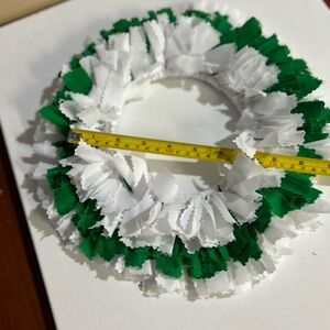 Handmade Rag Wreath approximately 8.5 inches. Colors- Green and white, brand new no tags. Great gift for office, front door,window, or just hang on the wall. Make me an offer!