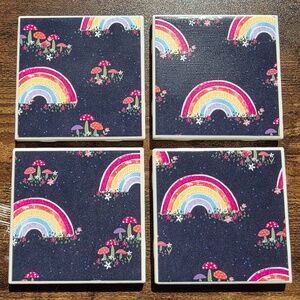 4 handmade ceramic coasters featuring a Rainbows & Mushrooms theme. Excellent condition. Never used. Cork backing.