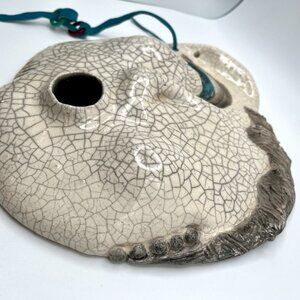 Unique handmade raku-fired ceramic mask dated Jan ’91, featuring dramatic crackle glaze, sculpted facial detail, and turquoise accent.