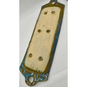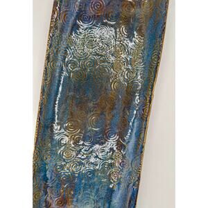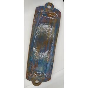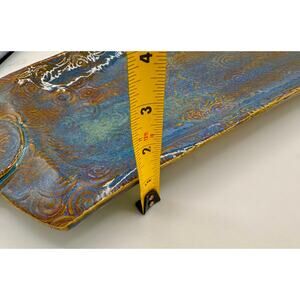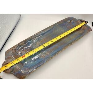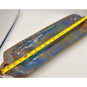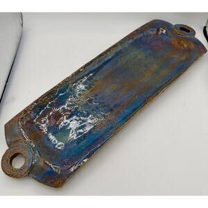 Stunning artisan pottery platter featuring a shimmering raku-style glaze with blue, violet, and copper tones. The rectangular form includes circular handles and embossed swirl texture throughout. Perfect as a statement serving piece, charcuterie tray, or decorative display.