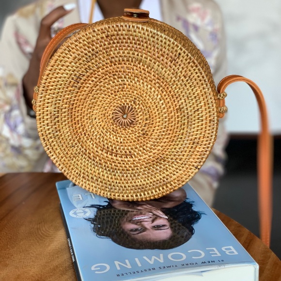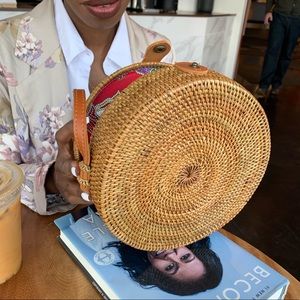 BRAND NEW handmade rattan shoulder bag with brown leather strap and colorful lining! Very in style right now!