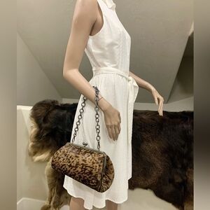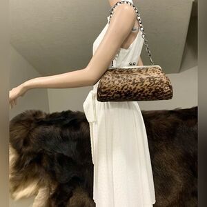Vintage style, great quality. Handmade from genuine hair on calf hide with chic embossed spotted pattern. It holds a lot, spacious enough for your phones, large wallet, cosmetics, compact umbrella, credit cards, keys & other items that you may need. Includes 2 strap styles can be used as a shoulder bag or crossbody. Accessorize as a day or evening bag, or a gift for an important someone.