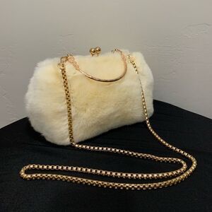 Vintage style. Chic design. Handmade from dyed rex rabbit fur, metal frame and handle, includes 2 detachable chain styles, also chains can be for enhanced decoration, see photos for visual options. Use in multiple ways, hand carry, wear as a wristlet, shoulder bag or crossbody.