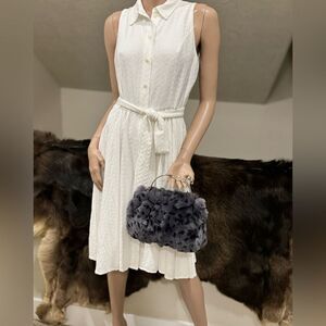 real rex rabbit fur block stitched, soft side design, with kiss-lock metal frame. Use in multiple ways, hand carry, shoulder bag or as a crossbody. Spacious enough for your phone, cosmetics, sunglasses, compact umbrella, credit cards, keys and other items. It's perfect for casual wear, or a gift for an important someone.