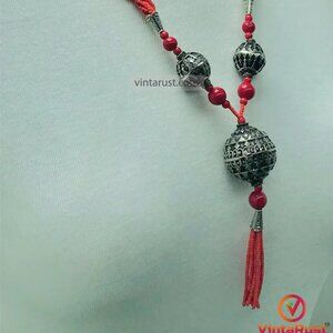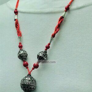 • Add cultural hues and elegance to your jewelry collection with this handmade red beaded necklace featuring a striking tribal-inspired pendant. This vibrant piece combines traditional craftsmanship with modern design, making it a perfect accessory for those who love boho chic jewelry.