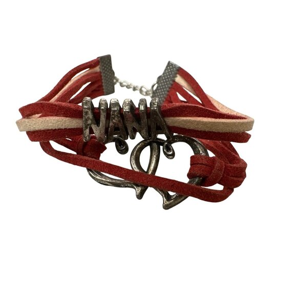 A stylish bracelet featuring red and beige suede straps with a "Nana" charm and heart pendant, adjustable chain for a secure fit.