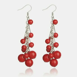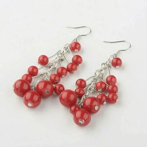 Handmade Red Dyed Mashan Jade Gemstone Beads Silver Plated Dangle Chain Earrings