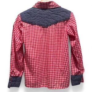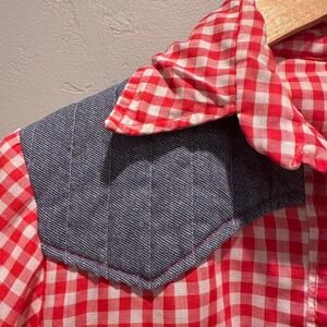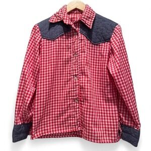 Handmade Red Plaid Button Down Western Shirt Denim Accents Size Small