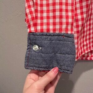 handmade red plaid button down shirt with denim accents